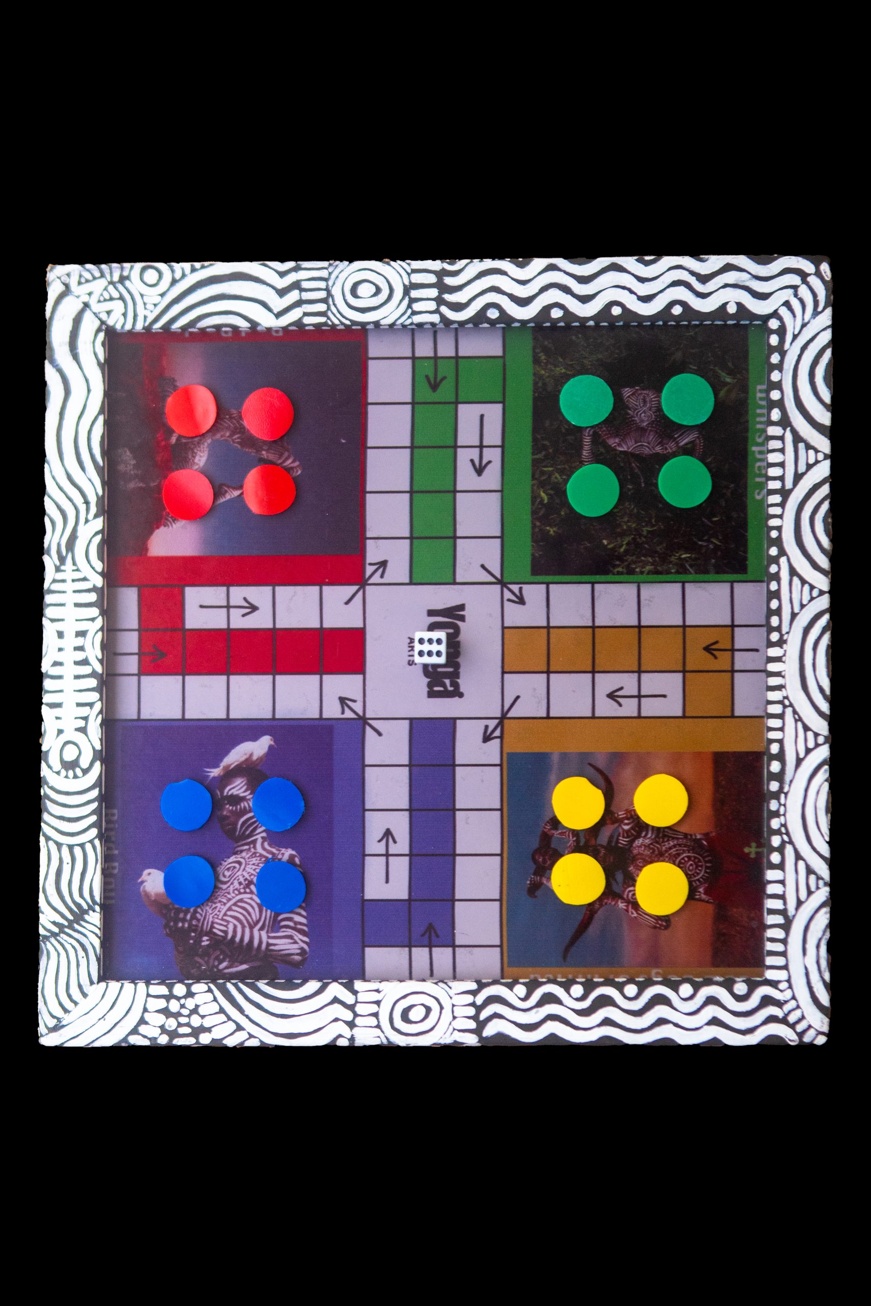 The board’s frame is meticulously hand-painted, turning the familiar layout into a vibrant visual field of rhythm and meaning. Selected images from Oscar’s art portfolio are embedded within the design, connecting his broader body of work to the spirit of the game.
