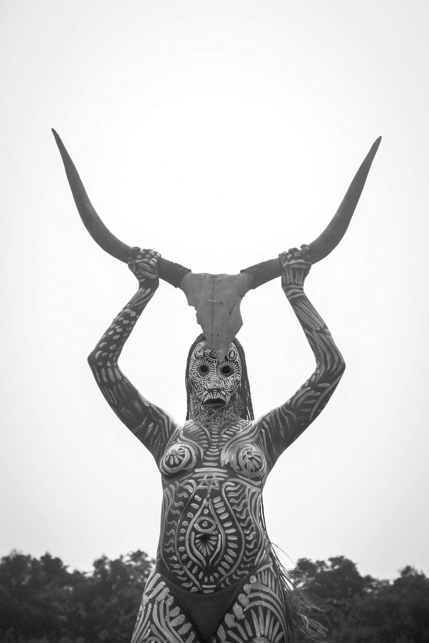 The piece was inspired by the Egyptian goddess Hathor. The image of a woman who is half-nude and holding a skull of a cow with large horns is a powerful visual representation of the goddess.